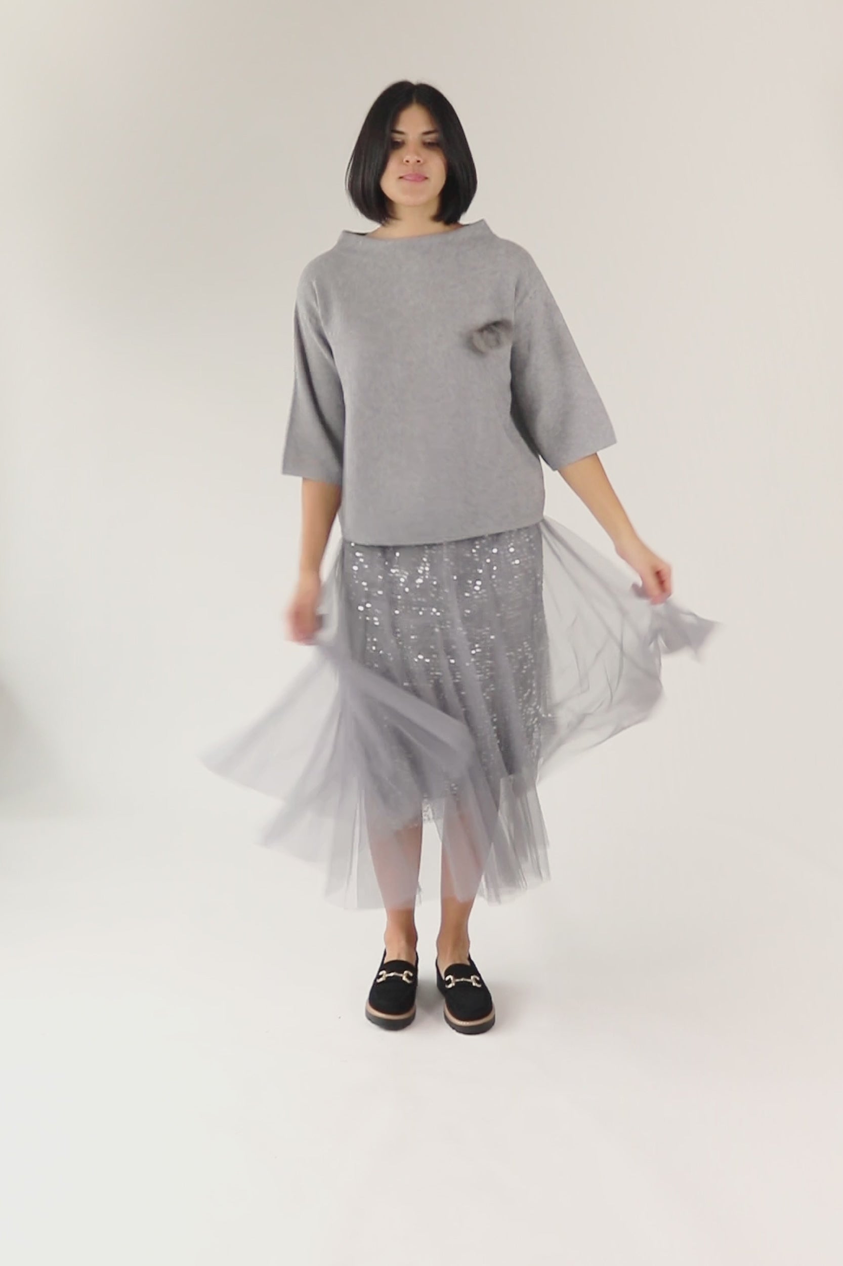 Deze maxi -rok met sprankelende pailletten en een elegante tule -overschrijding is het ultieme statement -stuk voor speciale gelegenheden en glamoureuze uiterlijk. De losjes dalende snede zorgt voor een stromend, vrouwelijk silhouet dat elegant over de heupen en benen glijdt.