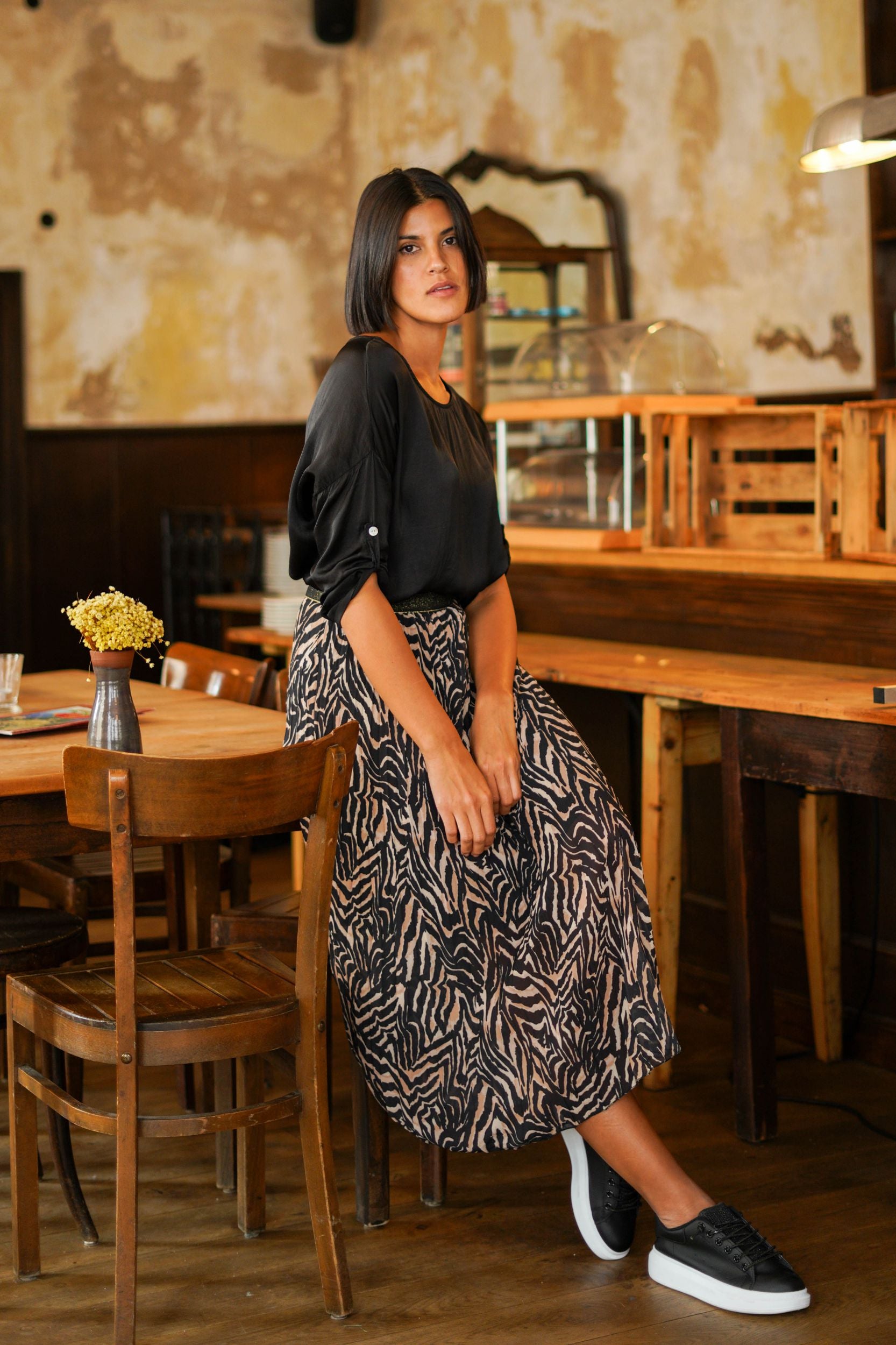 Im Herbst kann Animal Print einen warmen und erdigen Touch in Ihre Garderobe bringen. Kombinieren Sie ein Leopardenmuster-Oberteil mit einer neutralen Hose oder einem Rock, um einen eleganten und dennoch bequemen Herbstlook zu kreieren. Sie können auch Animal Print-Accessoires wie Schals oder Stiefel tragen, um Ihrem Outfit eine subtile Note zu verleihen.