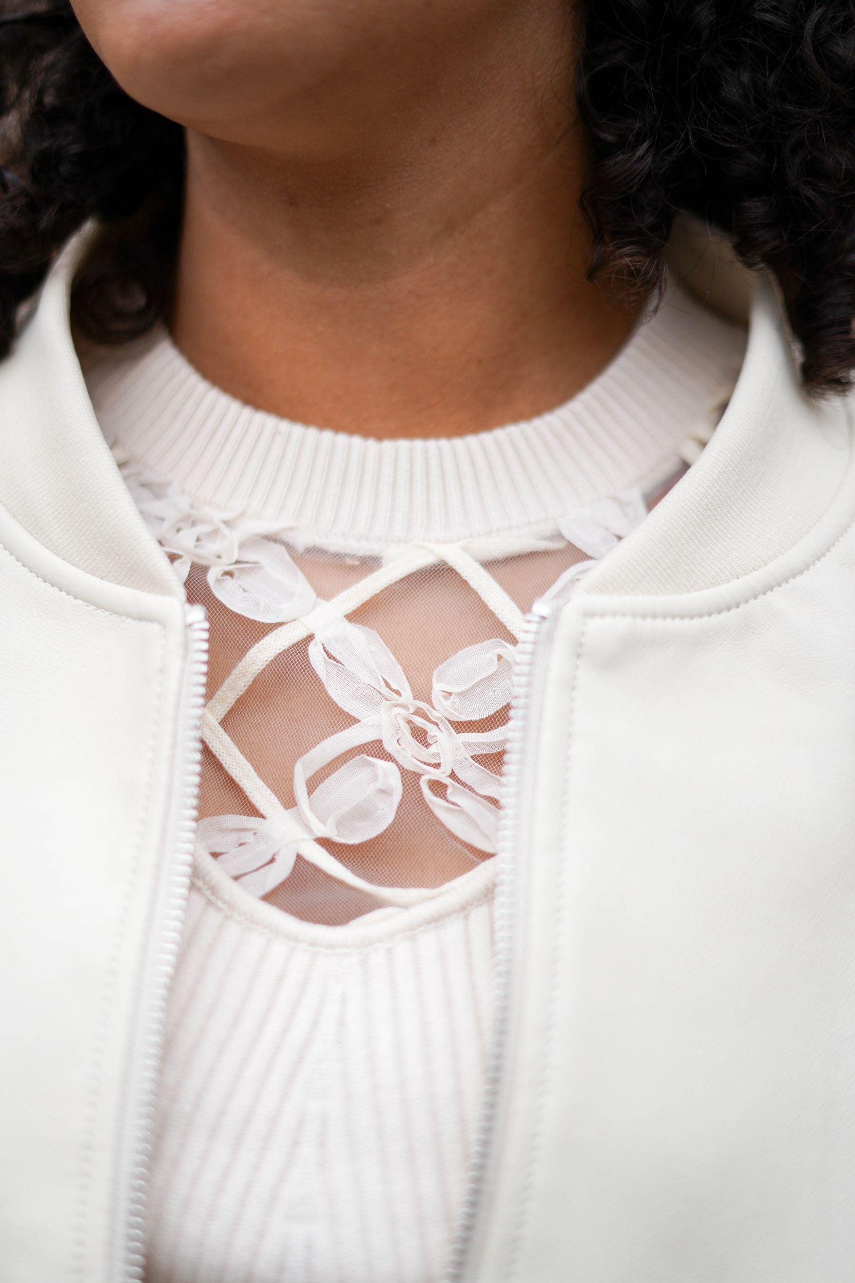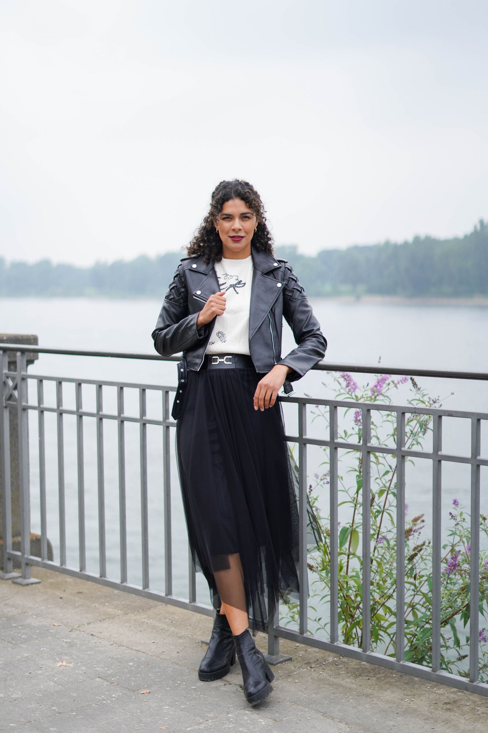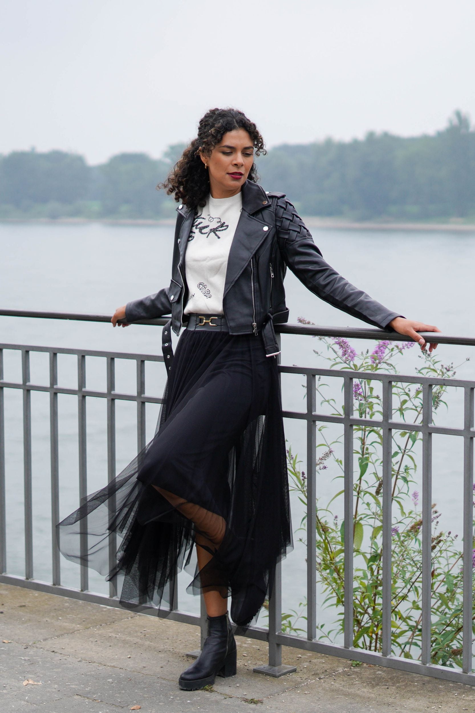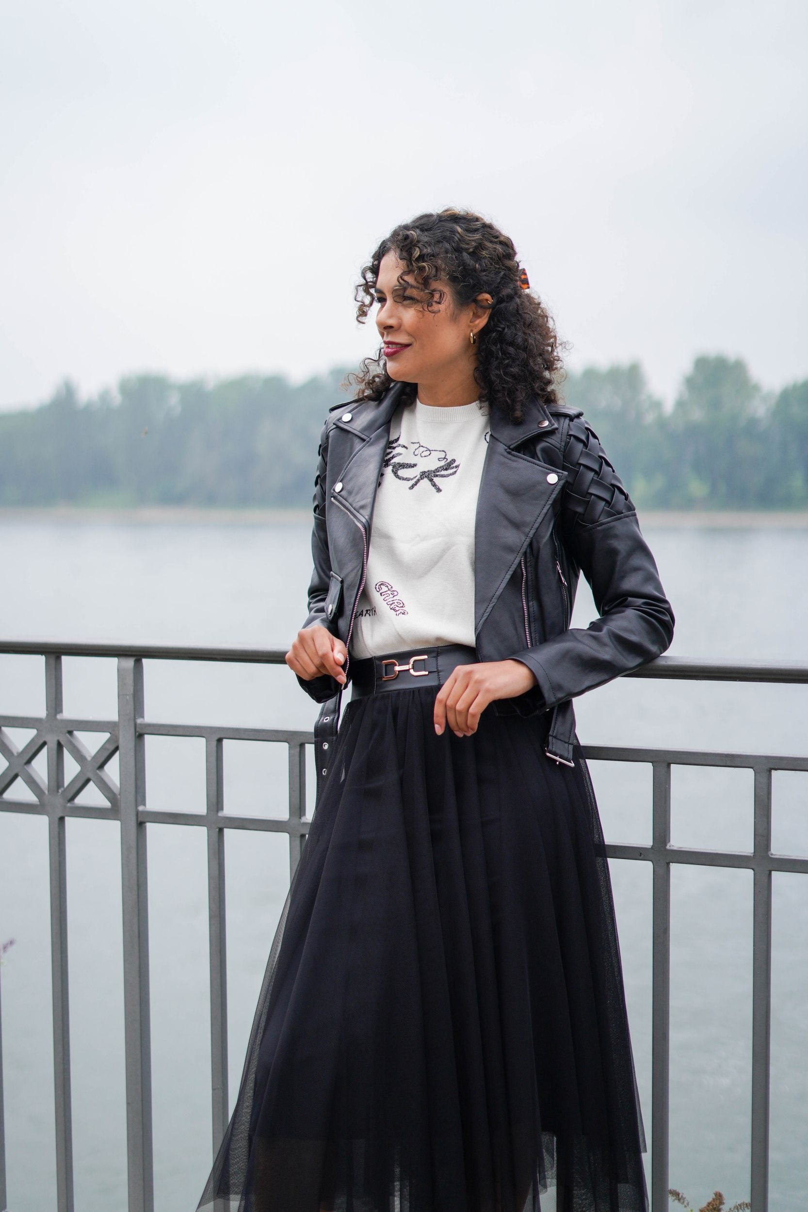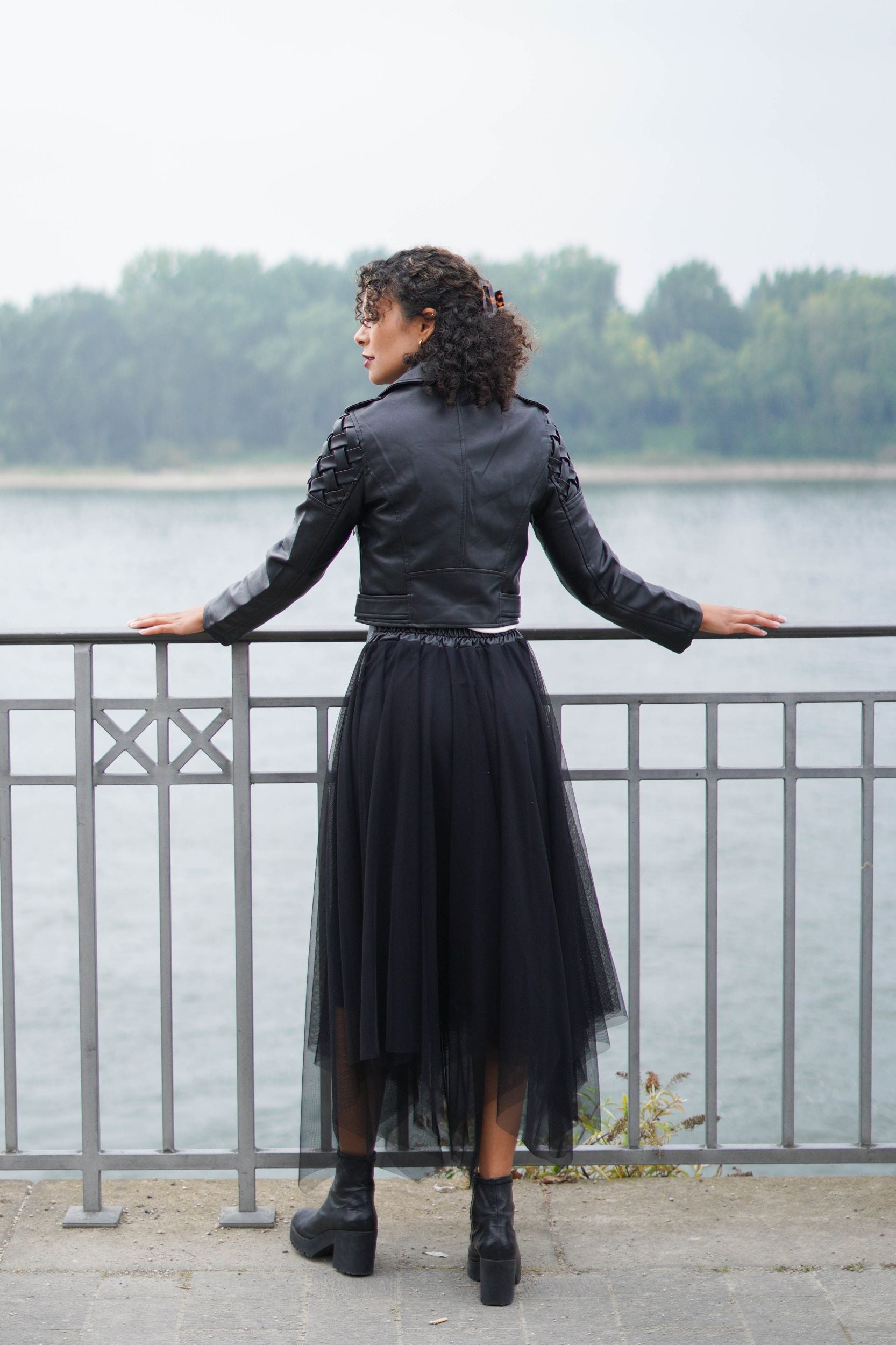 Lederjacken strahlen Stärke, Robustheit und ein gewisses Maß an Rauheit aus, während Tüllröcke durch ihre zarten, transparenten Schichten eine luftige und feminine Eleganz vermitteln. Die Kombination dieser beiden Elemente schafft einen reizvollen Kontrast, der das Auge anzieht. Diese Gegensätze ergänzen sich und verleihen dem Outfit eine ausgewogene Harmonie.