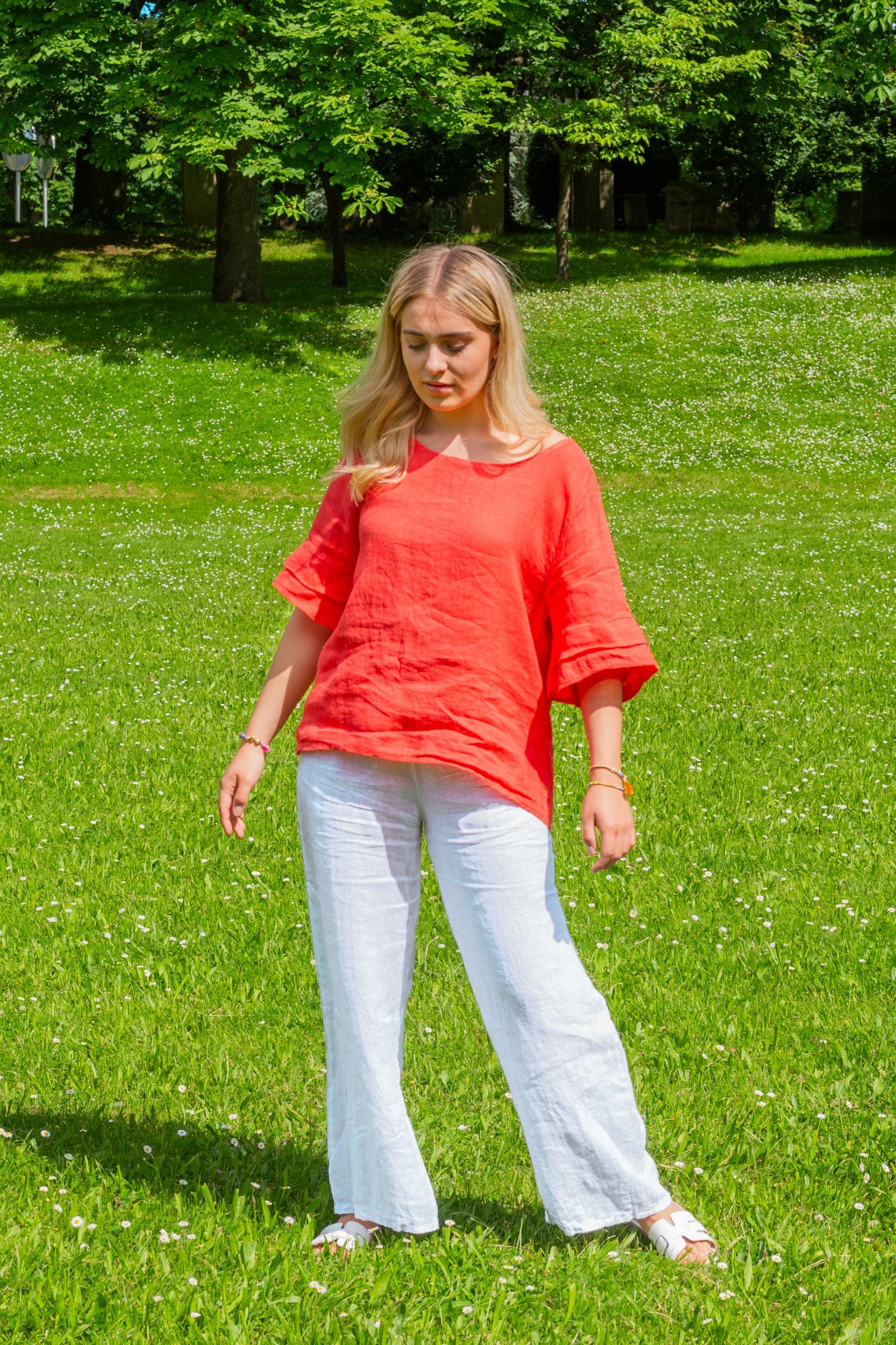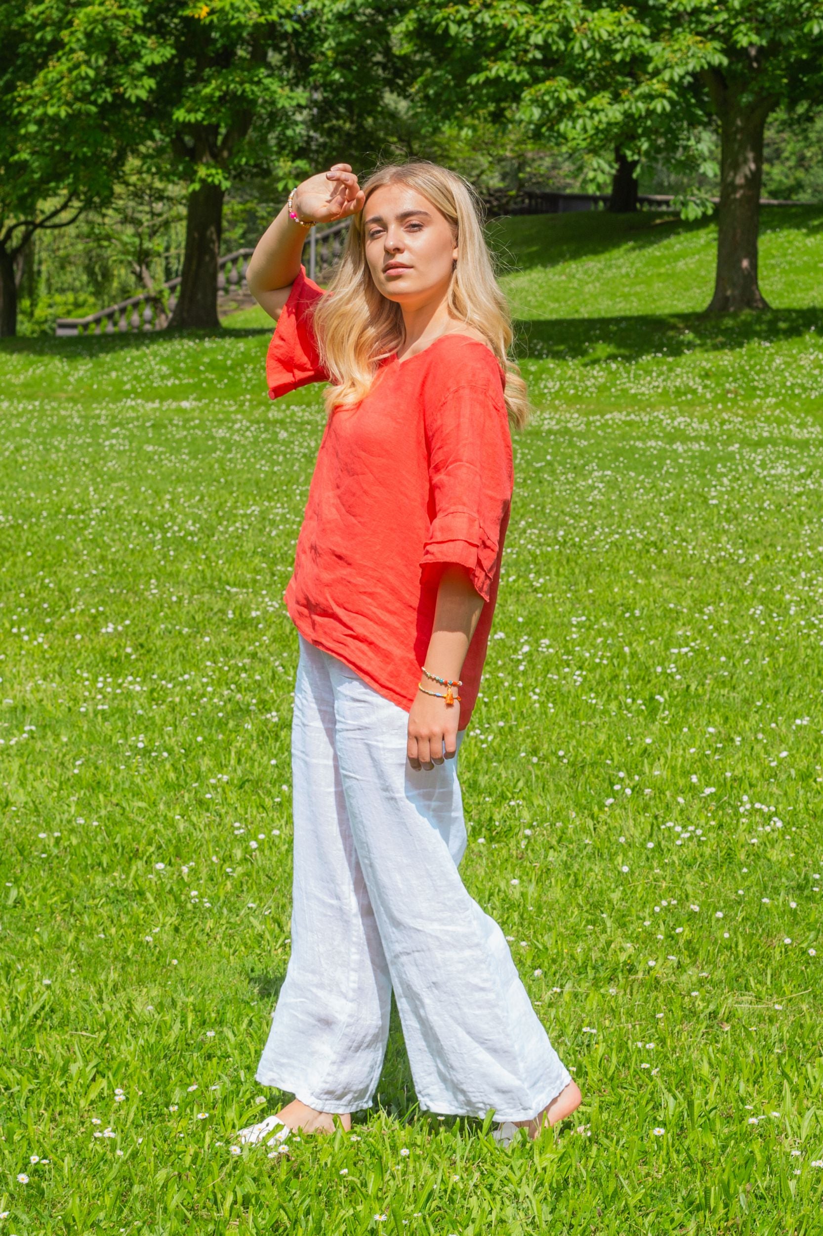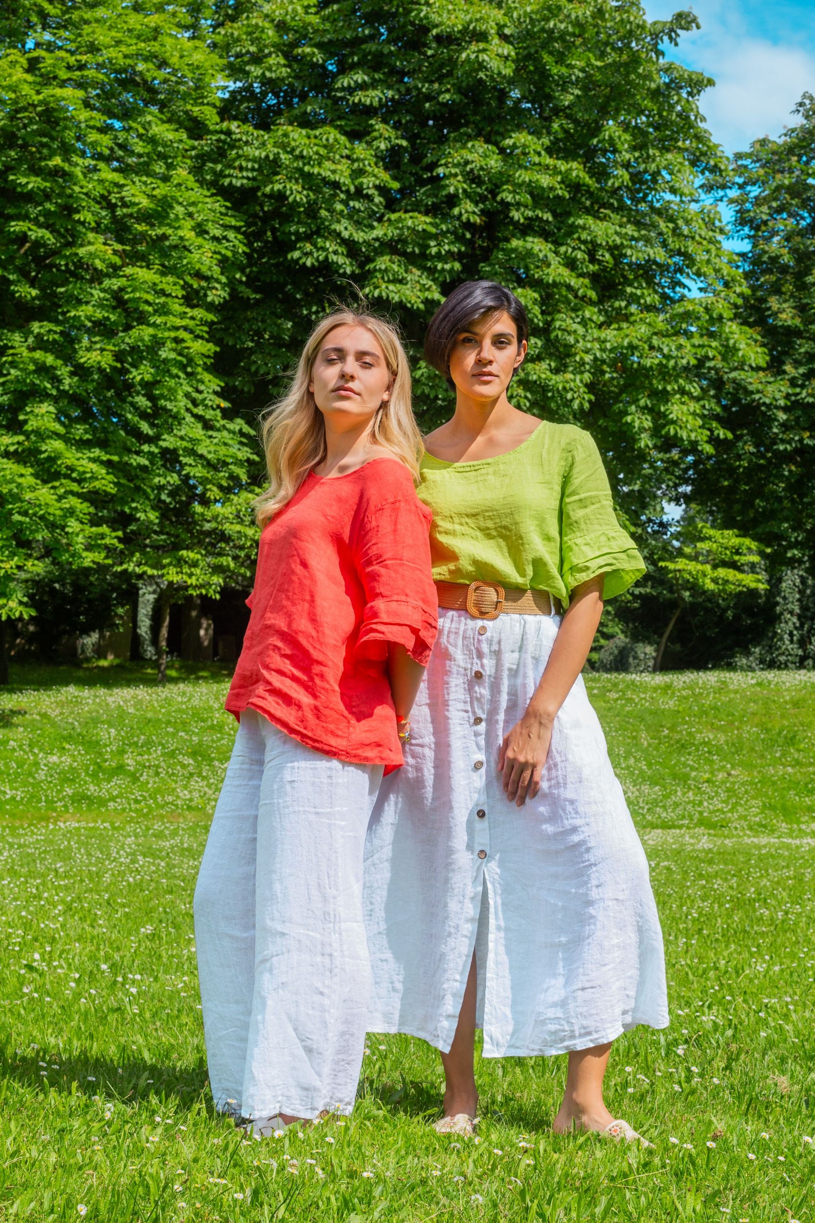 Unsere Kollektion bietet eine Palette natürlicher und moderner Farbtöne, die perfekt für die Sommergarderobe sind. Erdtöne, kühle Blautöne und klassische Weiß- und Rottöne lassen sich leicht kombinieren und verleihen jedem Outfit eine subtile Eleganz. Die natürliche Textur des Leinens verleiht jedem Stück eine besondere Tiefe und einen einzigartigen Charakter.