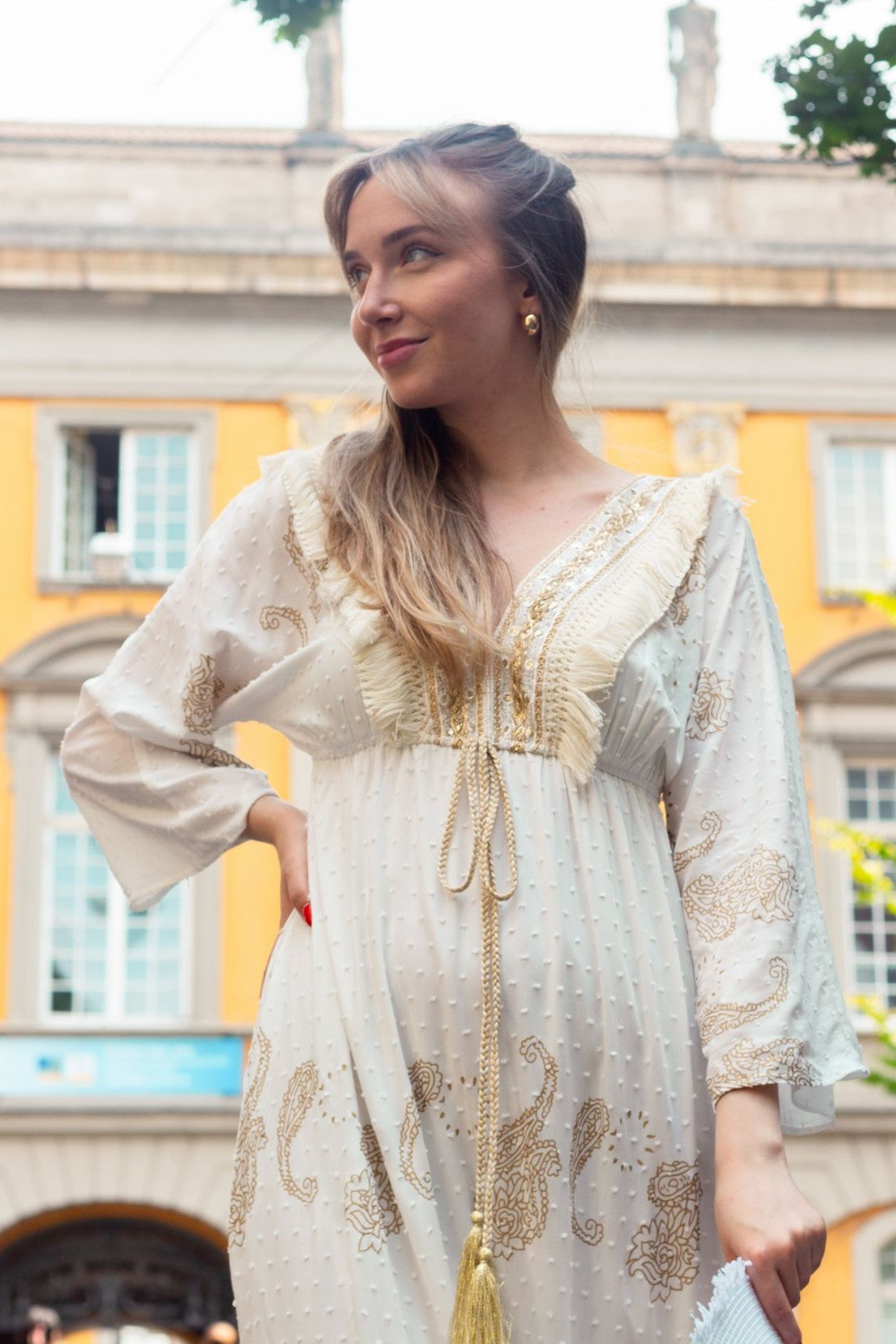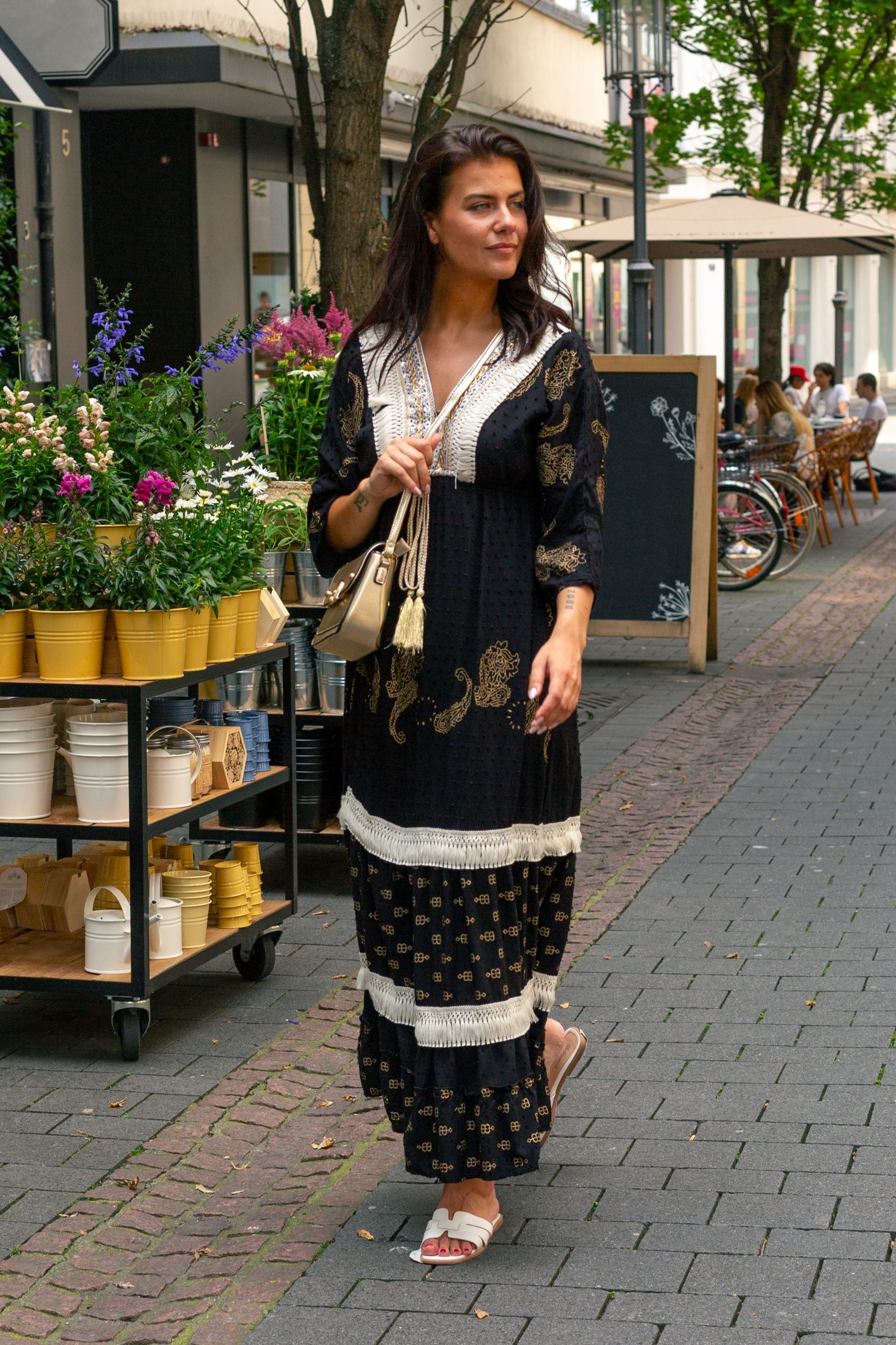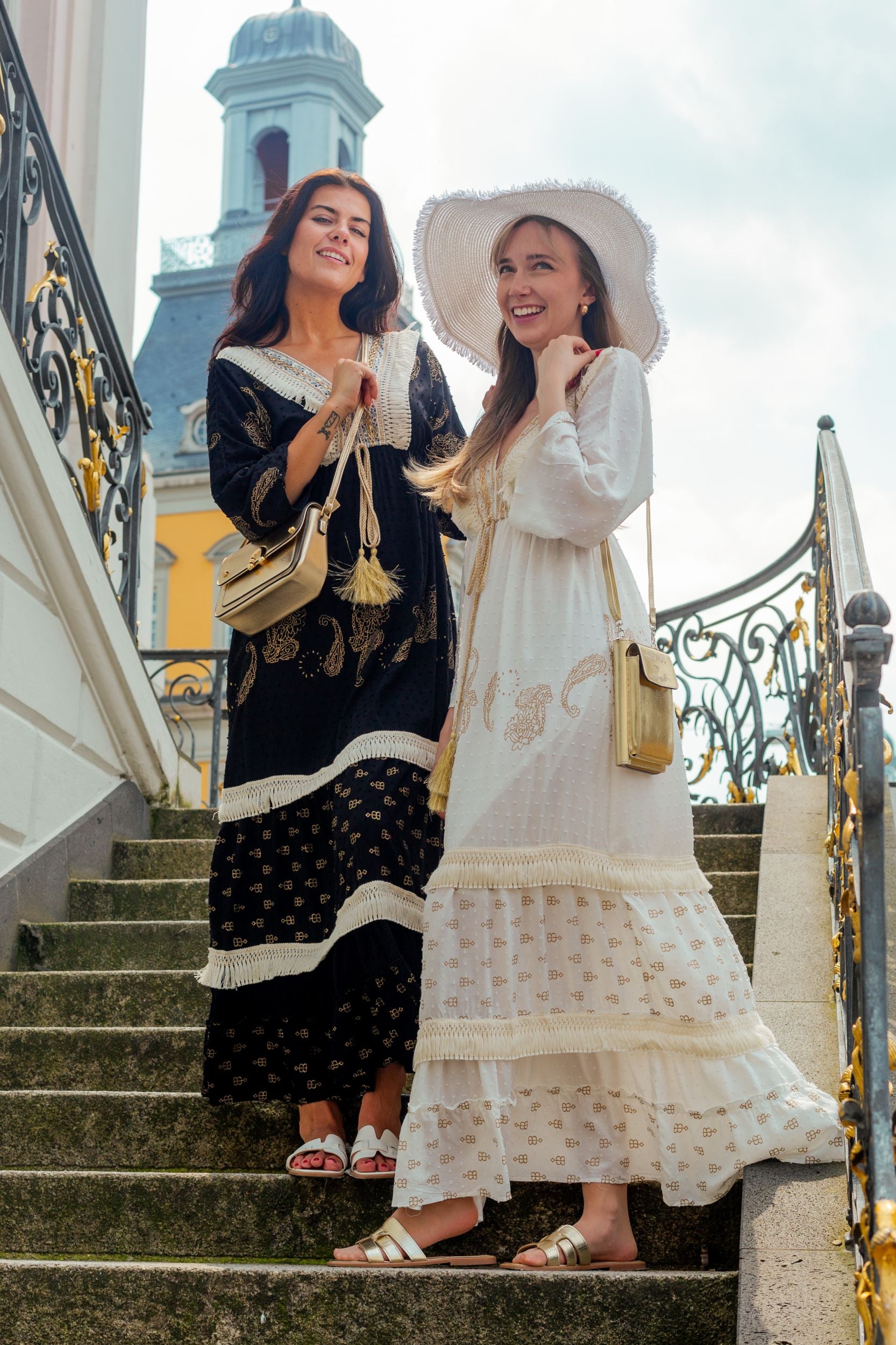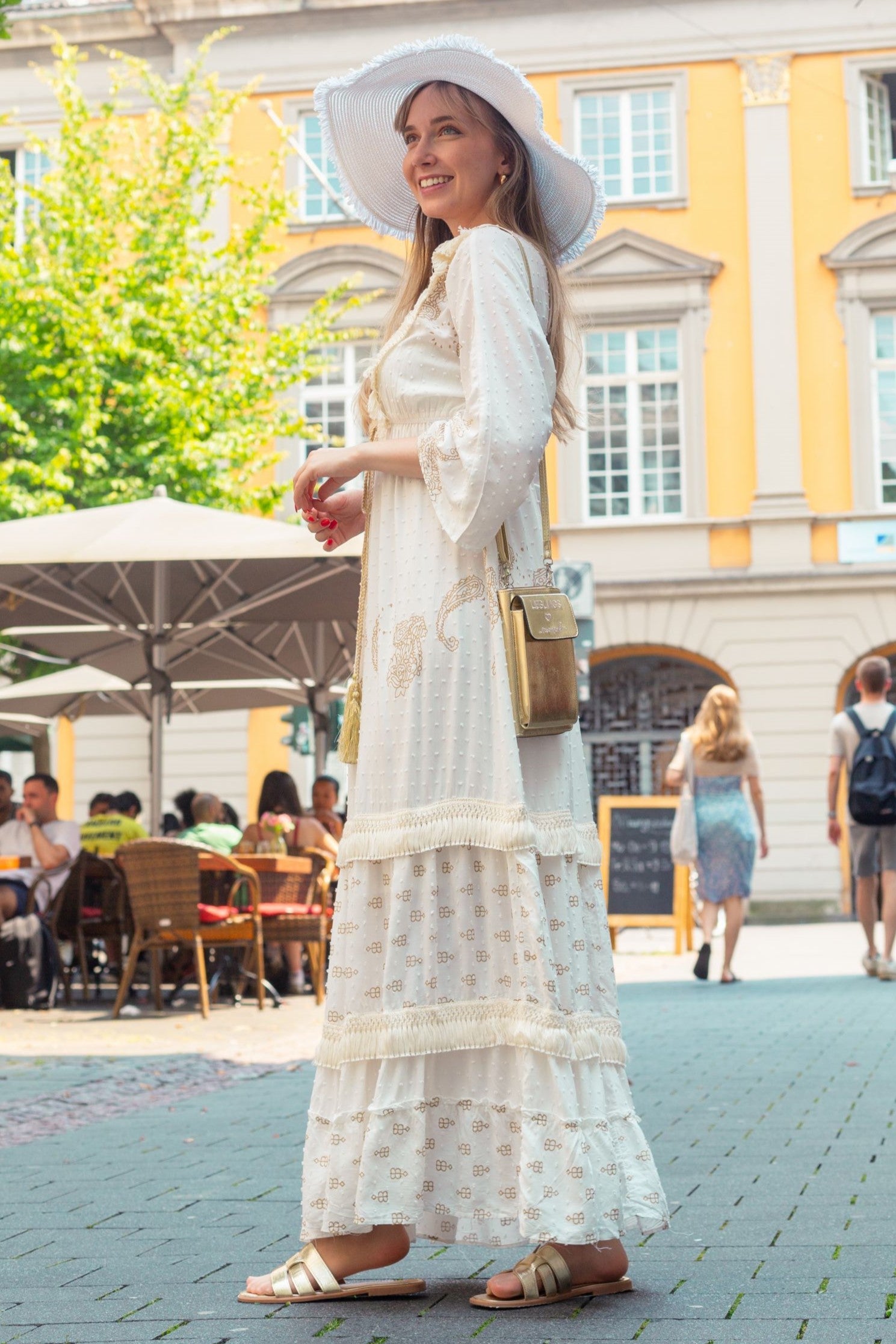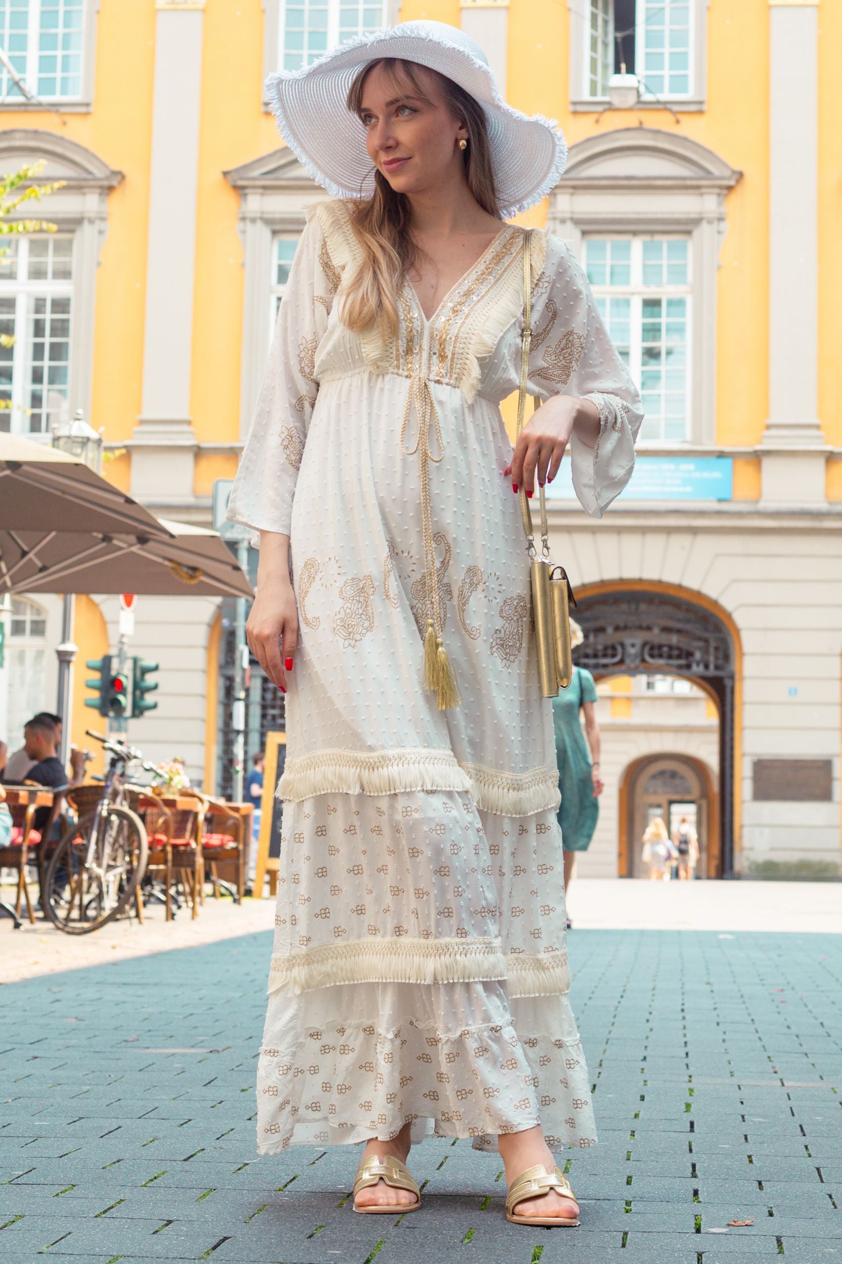 Ein langes Sommerkleid mit goldenen Details ist ein unglaublich vielseitiges Outfit. Geeignet für eine Vielzahl von Anlässen, kann es mühelos von Tagesveranstaltungen wie Gartenpartys und Brunches bis hin zu Abendveranstaltungen wie Cocktailpartys und formellen Abendessen getragen werden. Kombinieren Sie sie mit Riemchensandalen oder Keilabsätzen für einen entspannten Tageslook oder veredeln Sie sie mit auffälligem Schmuck und Absatzschuhen für ein glamouröses Abendensemble. Diese Kleider sind darauf ausgelegt, dass Sie sich selbstbewusst und strahlend fühlen, egal zu welchem Anlass.